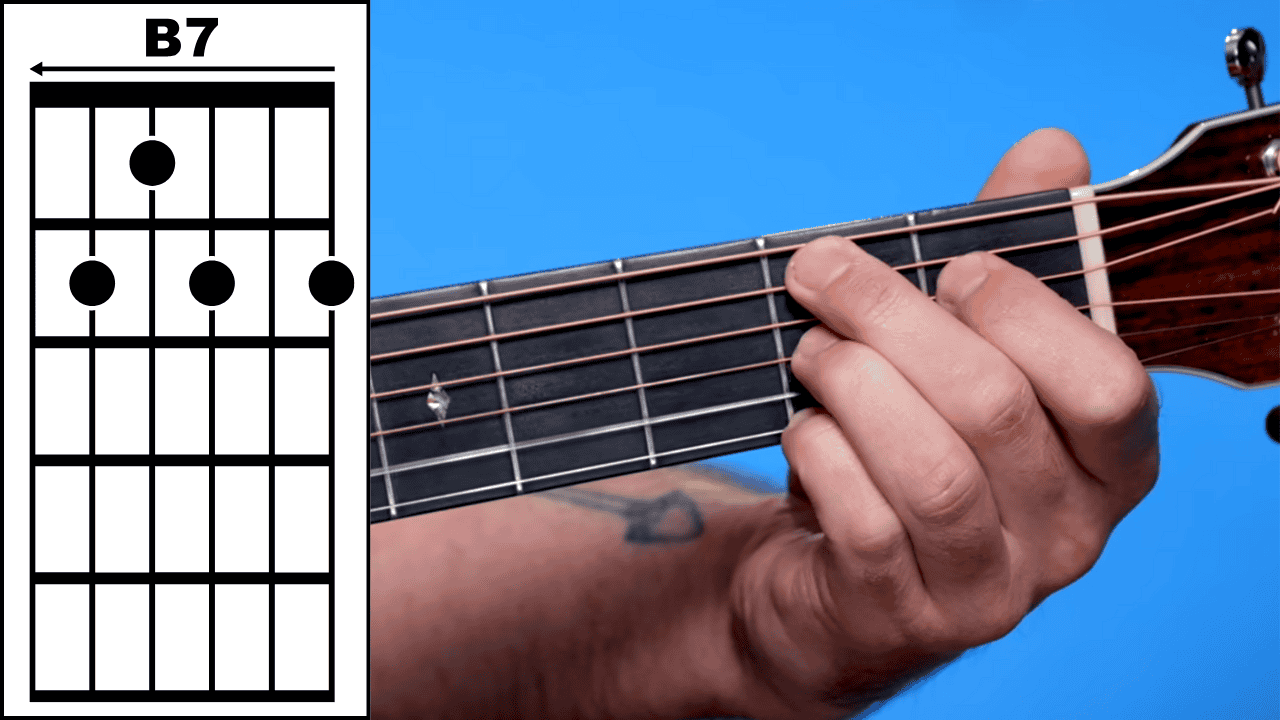 If the full open B7 keeps tripping you up, use a simpler version and keep playing the song. You can come back to the full shape later when your fingers feel less cramped.