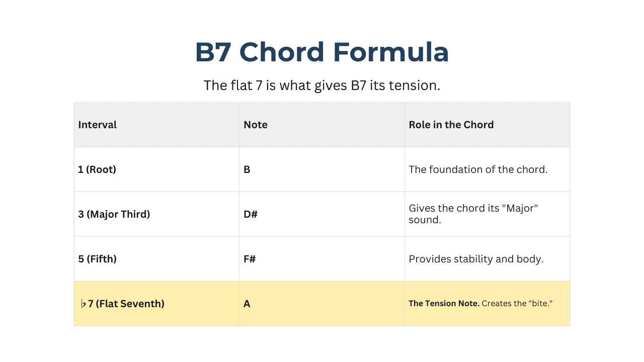 B7 is a four-note chord that carries tension on purpose. That little bite is what makes it feel like it wants to move somewhere instead of sitting still.