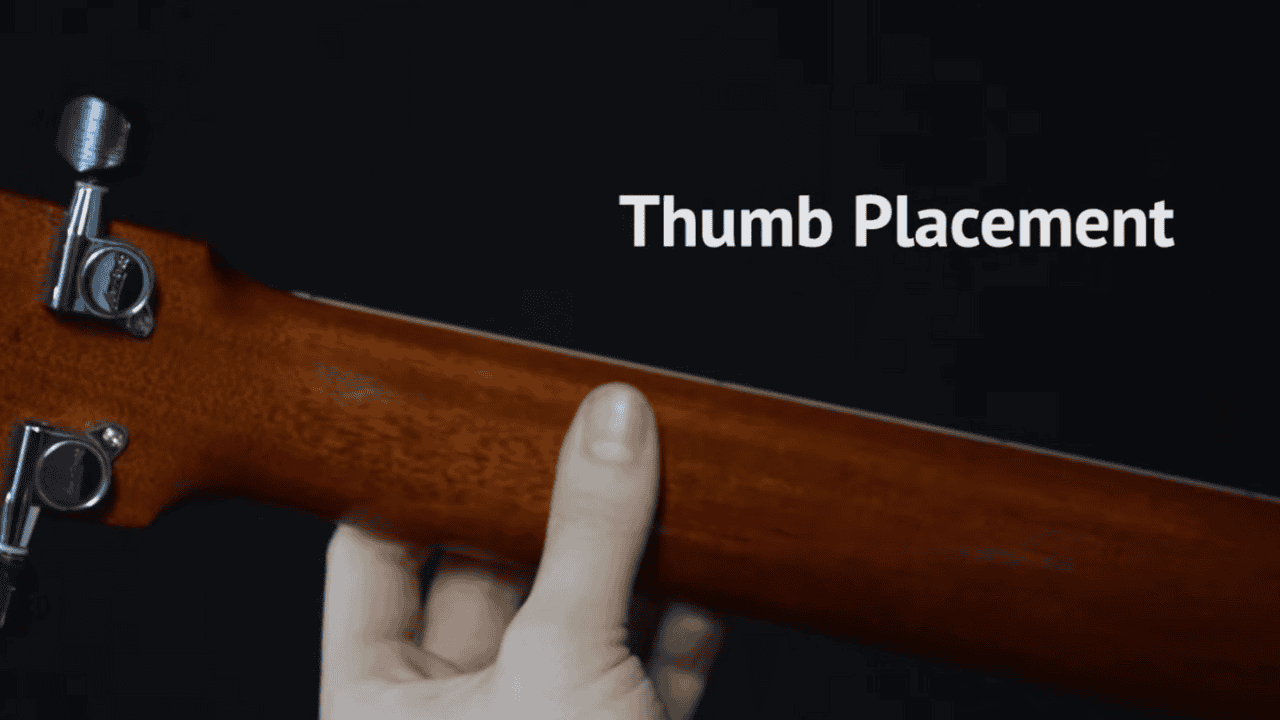 The fix: place the thumb centered on the back of the neck, roughly behind the 2nd fret, so your wrist moves forward and your fingers get space to curve